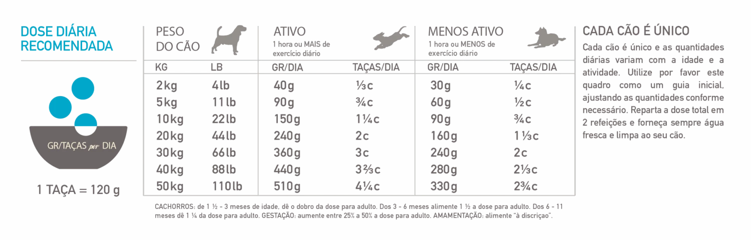 La energía metabolizable es de 3.850 kcal/kg (462 kcal por taza de 250 ml/120 g)