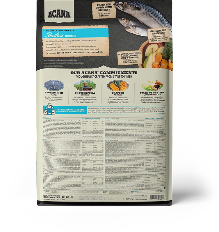Sin cereales ni carbohidratos de rápida absorción como los del arroz, la tapioca o la patata, Acana Pacífica contribuye a mantener una salud óptima para perros de todas las razas y edades.