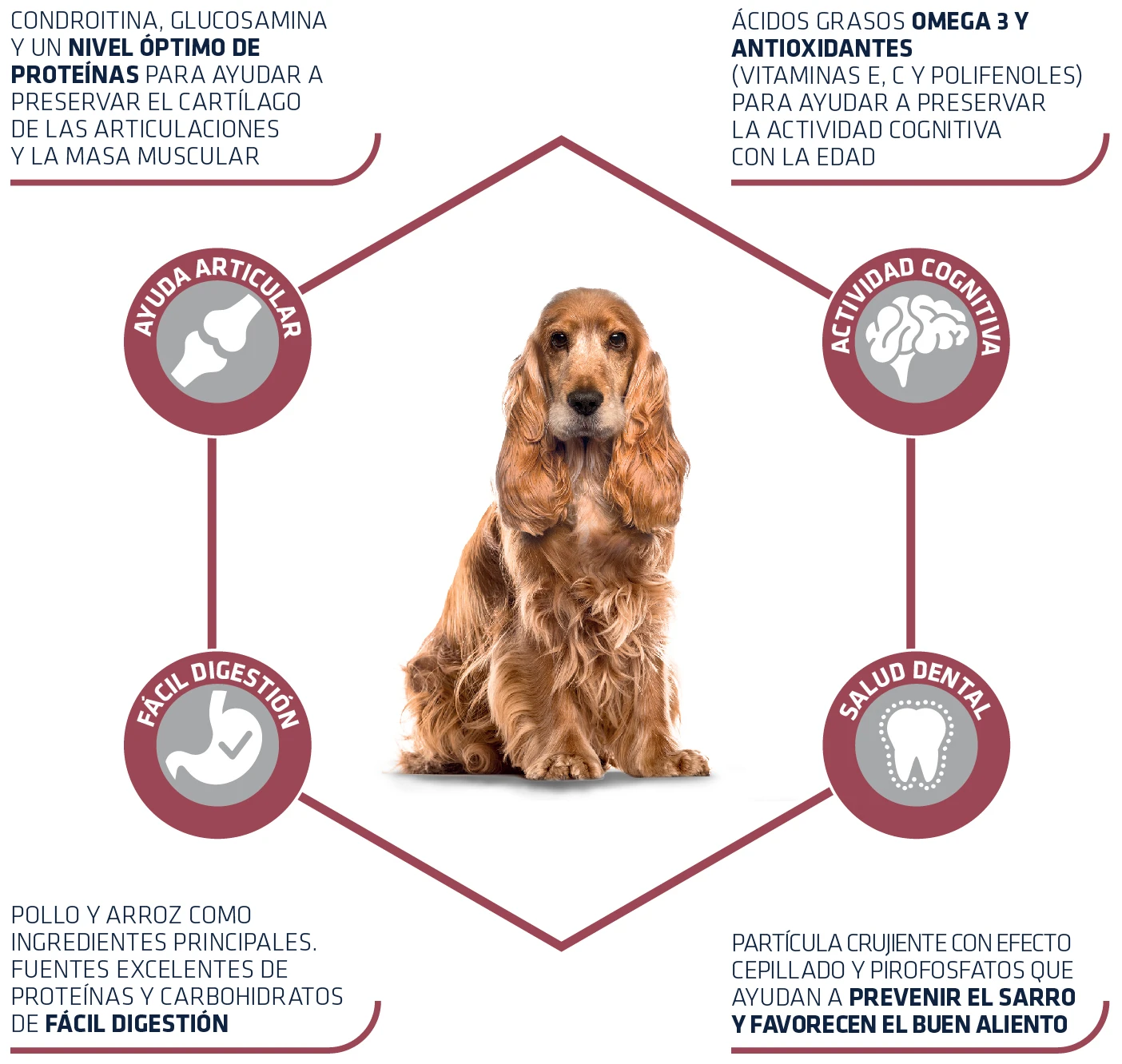 Indicado para perros de raza mediana desde los 10kg, a partir de los 7 años. Alimento completo que ayuda a reducir los problemas de articulaciones debidos a la edad. Su croqueta se adapta perfectamente a la mandíbula y dientes de razas medianas.