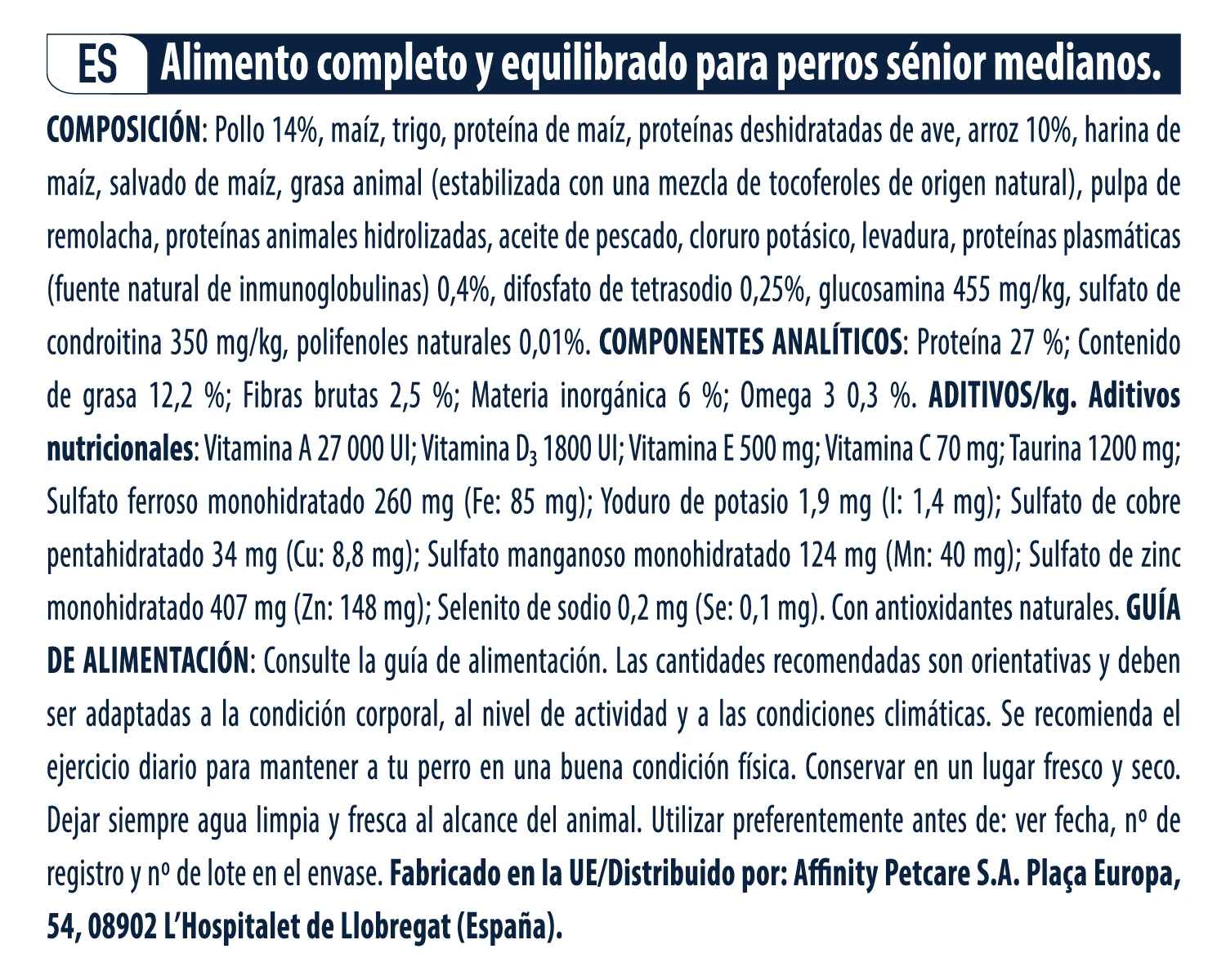 Ingredientes Canine Medium Senior Advance