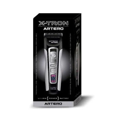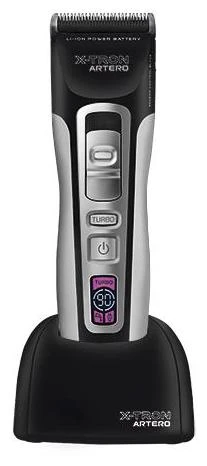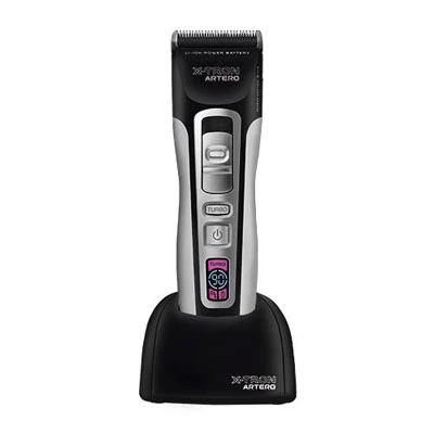 Máquina cortapelos con función turbo para perros. Artero X-Tron dispone de 2 velocidades y una autonomía de 1 hora y media. Además informa sobre el tiempo de uso disponible, aceite y batería baja. Incluye accesorios como base cargadora, cuchilla y recalces.