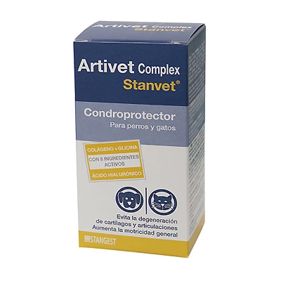 Artivet Complex es un condroprotector para perros y gatos con una fórmula innovadora muy completa que contiene 8 ingredientes activos.