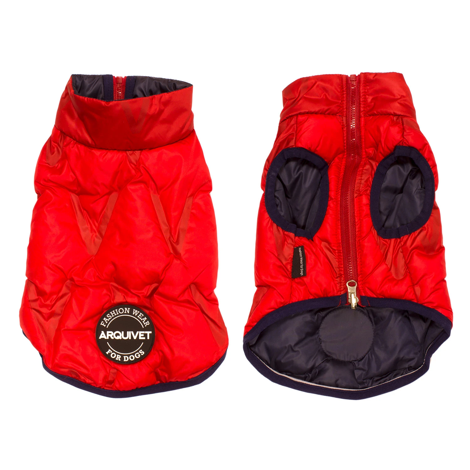 Chaleco acolchado reversible, colores Rojo-Negro. Orificios para patas delanteras. Apertura inferior mediante cremallera. Fácil de poner y quitar.