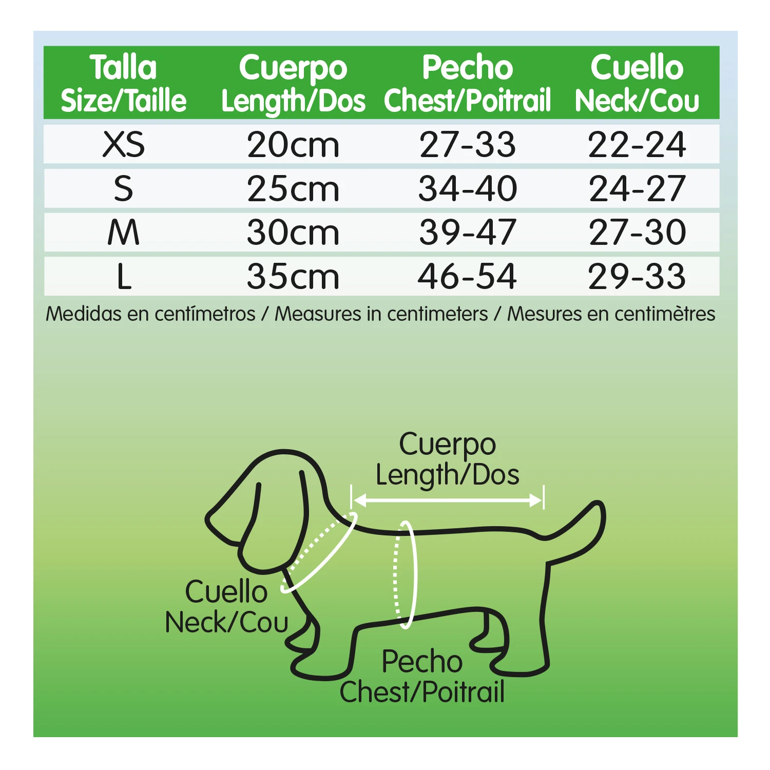 XS – Cuerpo: 20 cm Pecho: 27-33 cm Cuello: 22-24 cm