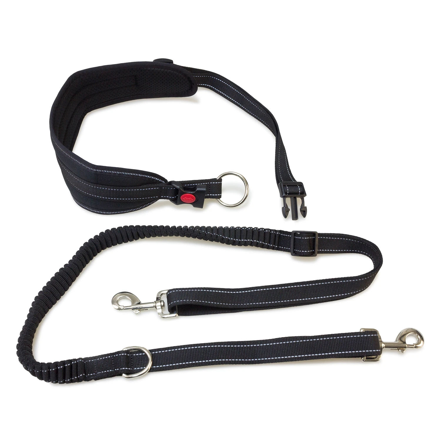 Correa con cinturón para practicar canicross con perros medianos. Cinturón acolchado manos libres y correa elástica con amortiguación. Fabricado en nilon resistente de color negro
