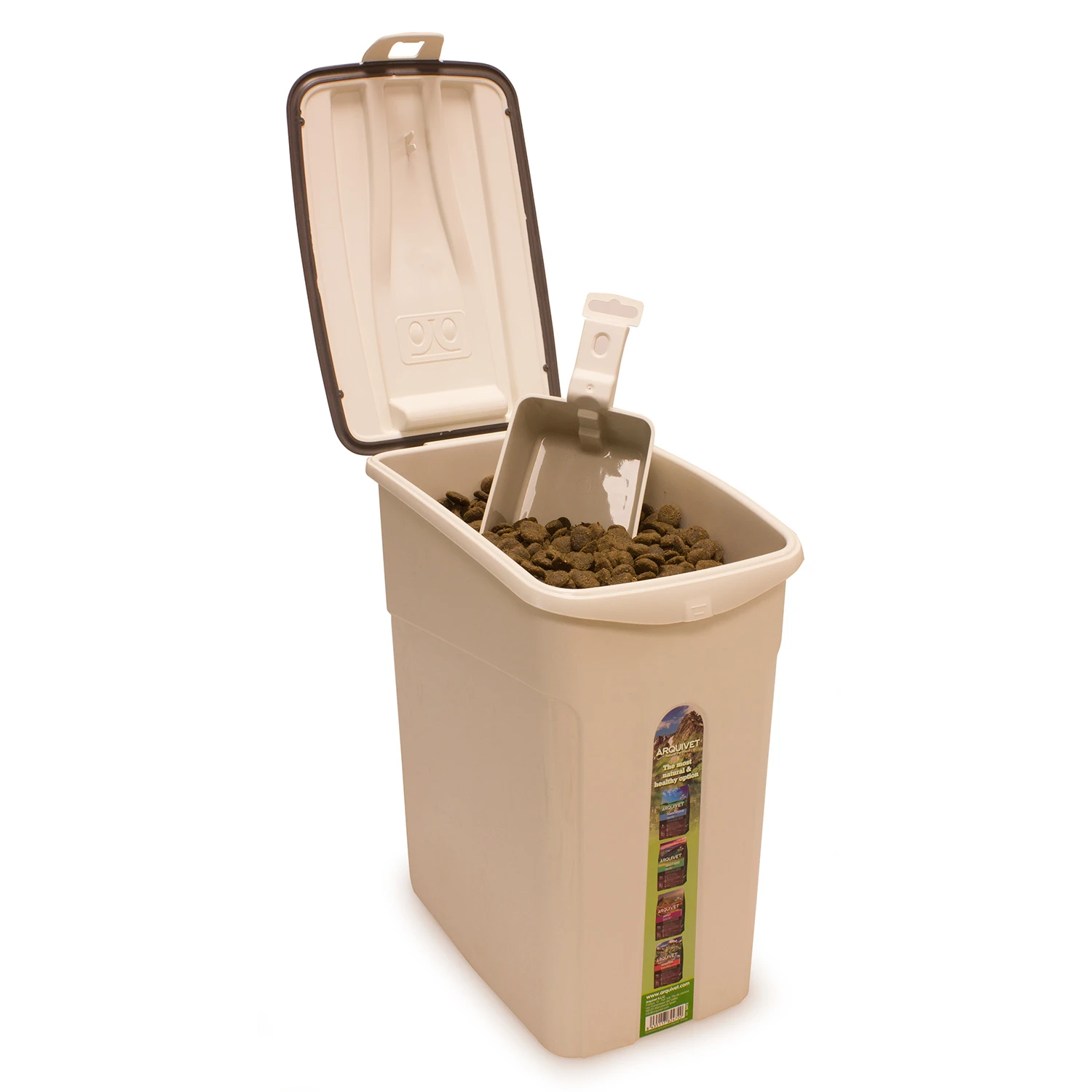 Mantiene el frescor de los alimentos y los protege de la humedad gracias a su cierre hermético de goma. Así mismo impide que entren los malos olores y los insectos. Incluye una pala para recoger los alimentos. Sin duda la manera más cómoda de guardar la comida de tus mascotas sin tener que estar pendiente se si has cerrado bien los sacos. Materia: plástico. Medida: 19,5 x 31 x 34 cm.