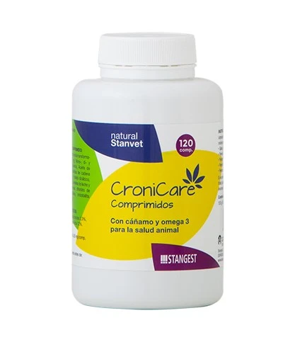 CroniCare Comprimidos es un suplemento nutricional a base de cáñamo (Cannabis sativa), omega 3 y triglicéridos de cadena media (TCM). Es una fuente de nutrientes claves para la salud de perros y gatos, ideal como refuerzo en casos de mayor demanda nutricional o en animales séniors.