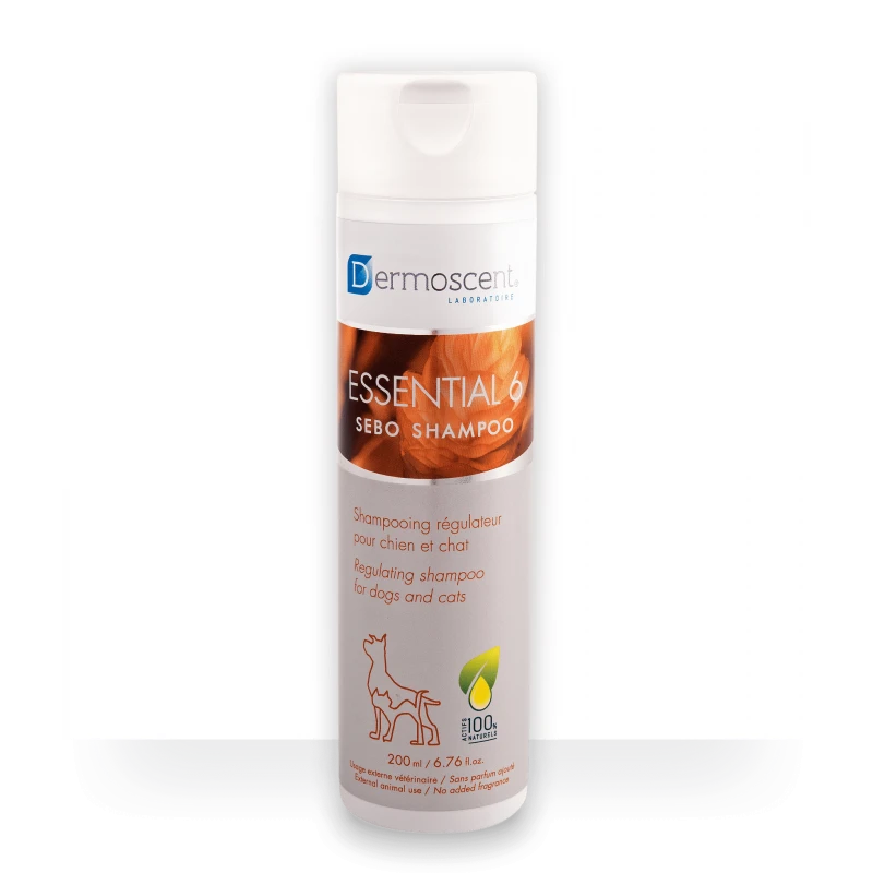 Essential 6® Sebo Shampoo es un champú seborregulador que actúa eficazmente contra los desequilibrios cutáneos (también denominados trastornos o problemas queratoseborreicos) y sus consecuencias: pelo apagado y quebradizo, manto seco o graso, malos olores, etc. No contiene fragancia y su fórmula concentrada, rica en ácidos grasos esenciales (omega 3 y 6) de origen vegetal contiene la misma combinación de aceites esenciales que Essential 6® spot-on más aceite esencial de niaouli.