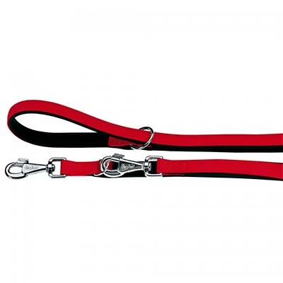 Correa de adiestramiento para perros acolchada y con largo ajustable. La correa Daytona es un modelo completo con anillos y mosquetones, preparada para soportar fuertes tirones. Cómoda asa para agarrar. Medidas: 20 mm ancho x 120 – 200 cm largo. Color: negro y rojo.