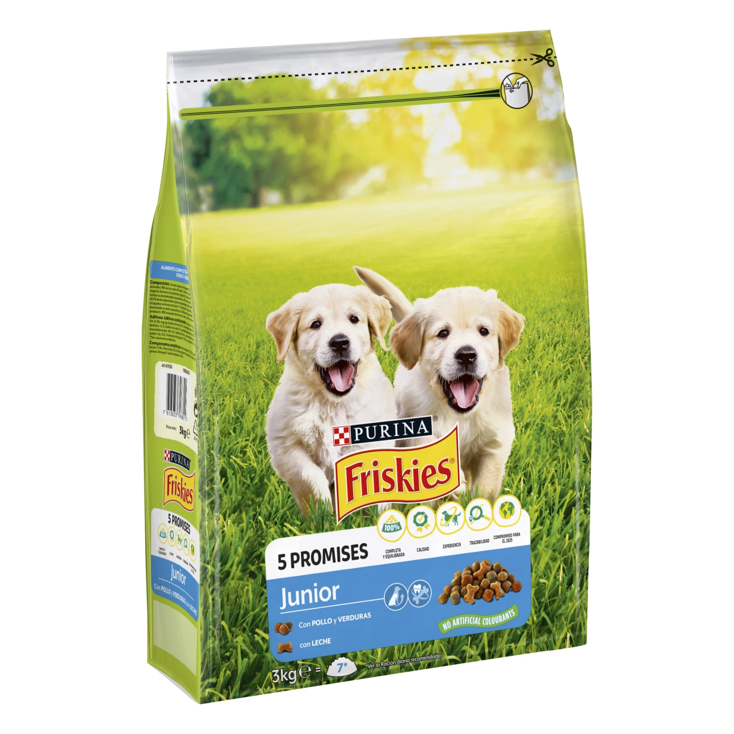 Pienso Friskies con pollo y leche para cachorros de todos los tamaños. Friskies Junior promueve un crecimiento sano, apoyando la formación de los huesos y dientes. Notarás evidentes signos de vitalidad: ojos y pelo más brillante y un estómago feliz. A partir de 6 semanas de edad. Disponible en 3 formatos.