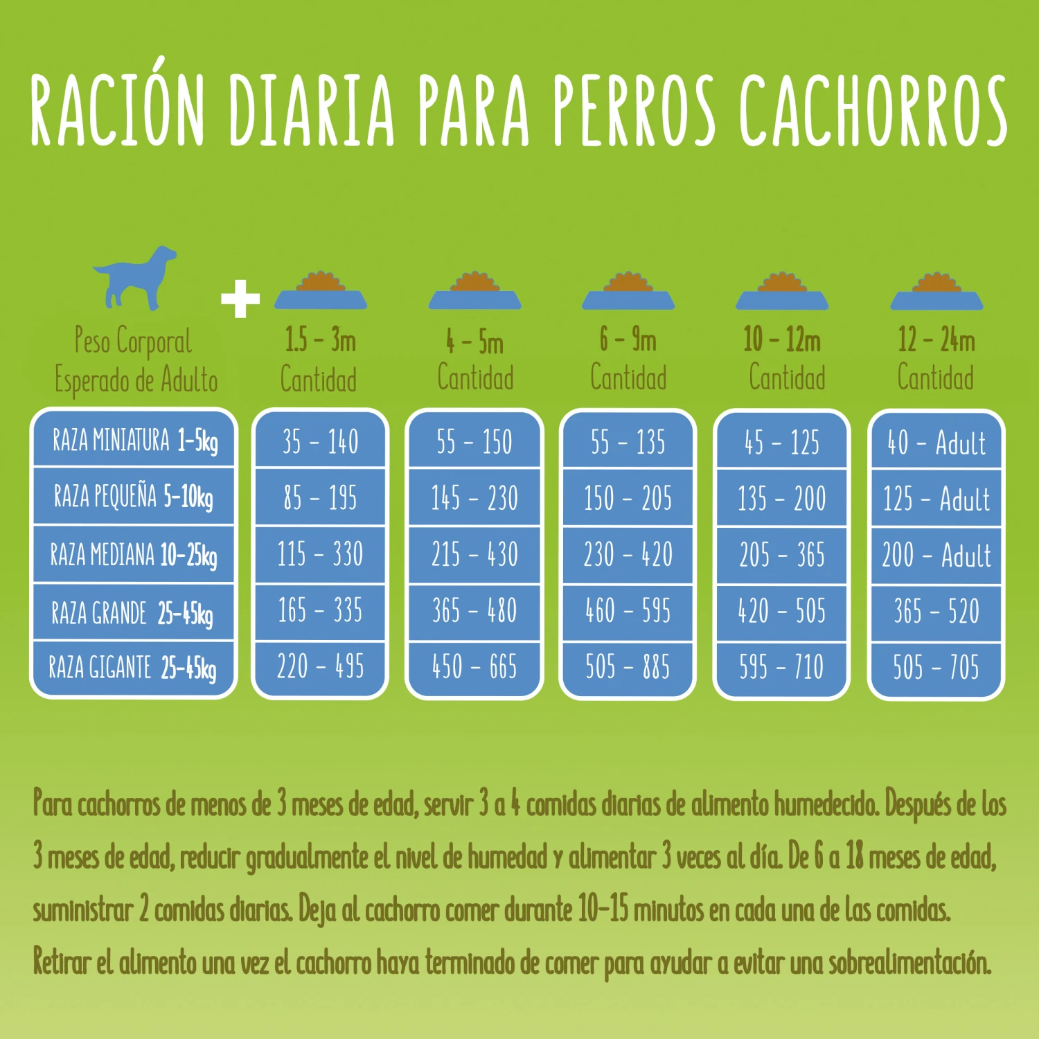 Beneficios claveAlimento completo para cachorros de todas las razas, a partir de 6 semanasFavorece el desarrollo de huesos y dientes para un crecimiento sanoElaborado con pollo y leche añadidasCon Vitafit, un complejo de vitaminas y ácidos grasos que refuerza la vitalidadEs 100% completo y equilibrado, con un nivel de proteínas adecuadoFavorece una digestión sana y unas heces compactasMantiene el pelo y los ojos brillantes, además de una piel sana