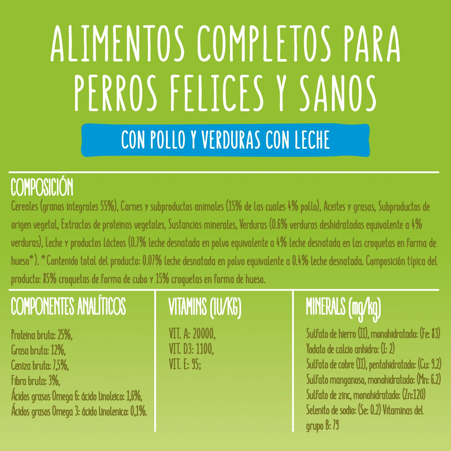 Cereales (cereales integrales 51 %), Carnes y subproductos animales (8 %)*, Extractos de proteínas vegetales, Aceites y grasas, Subproductos de origen vegetal, Azúcares, Sustancias minerales, Leche y productos lácteos (en las croquetas en forma de hueso: 0,7 % de leche desnatada en polvo equivalente a 4 % de leche desnatada), Verduras (en las croquetas en forma de cubo: 0,08 % de verduras en polvo equivalente a 0,5 % de verduras).