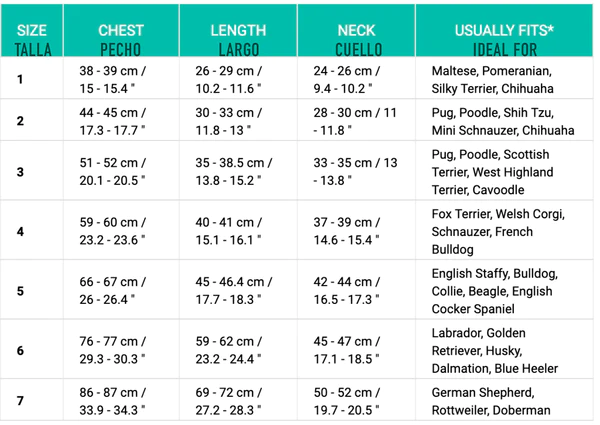 Talla 1 – Pecho:37cm Largo: 27,5cm Cuello: 31cm