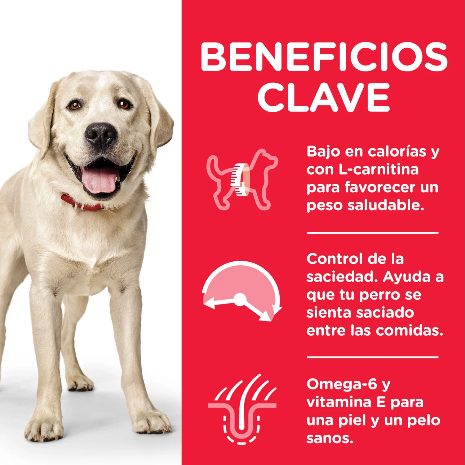 Beneficios de Hill’s Canine Adult Light Razas Grandes: Con ácidos grasos omega-3 y 6, para favorecer una piel sana y un pelo brillante.
