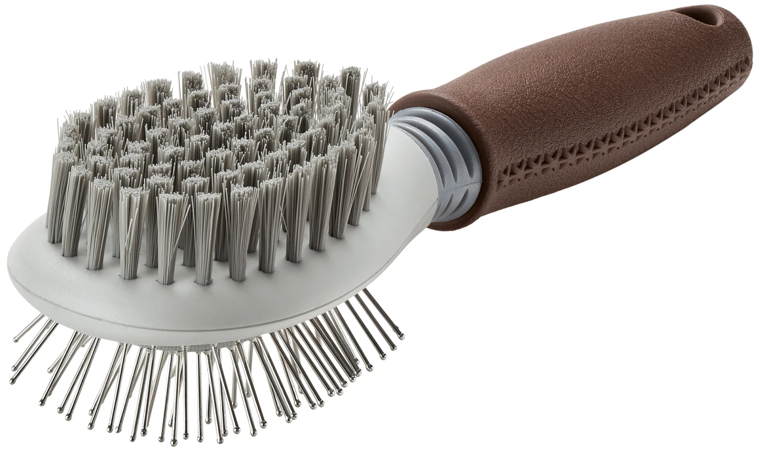 El cepillo para perros todoterreno para todo tipo de pelaje: con cerdas suaves en un lado y alfileres niquelados en el otro, este cepillo es adecuado para perros de pelo corto, mediano y largo. Las cerdas aseguran que los aceites se distribuyan de manera más uniforme por toda la capa, mientras que los alfileres ayudan a cuidar suavemente la capa superior y la capa base. El cuello flexible del cepillo evita que aplique demasiada presión, una ventaja real para garantizar el bienestar de su perro. El cepillo se adapta de forma óptima a la estructura del pelaje de su perro y a sus contornos. El agarre de forma ergonómica en un aspecto de cuero de alta calidad lo hace antideslizante y fácil de usar. Esto le permitirá dominar cualquier desafío de higiene peludo con un movimiento literal de muñeca.