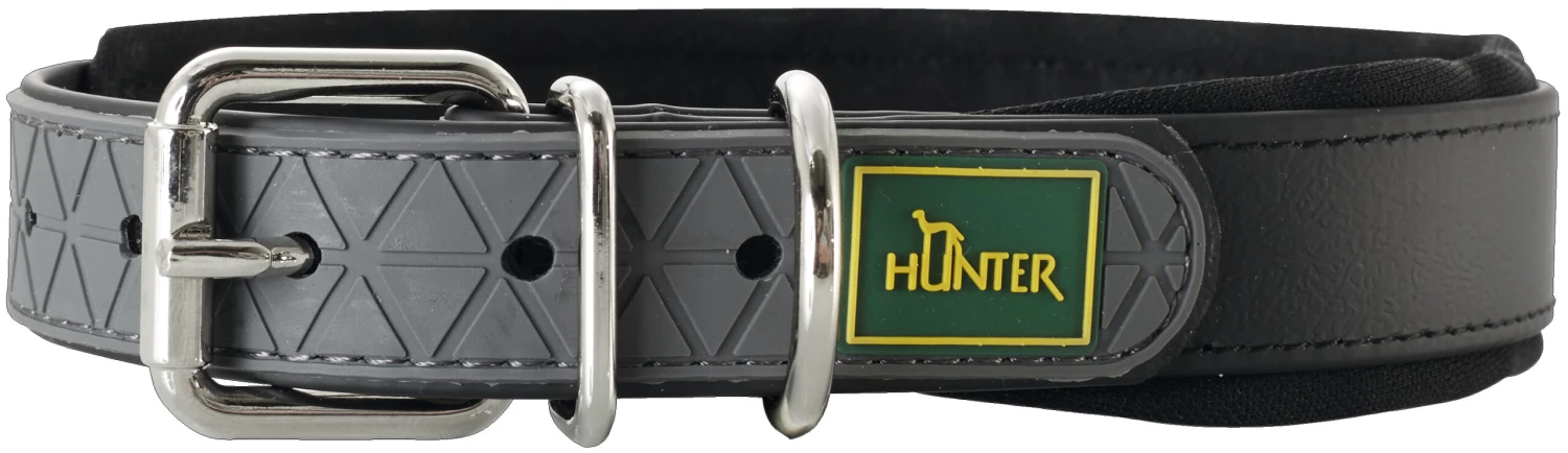 Collar CONVENIENCE resistente y fácil de limpiar, recubierto con neopreno. En HUNTER existe una amplia gama de collares con correas a juego, incluyendo correas de adiestramiento apra practicar y enseñar a nuestro perro fabricadas con una innovadora y resistente mezcla de plásticos disponibles en colores clásicos y en neón.