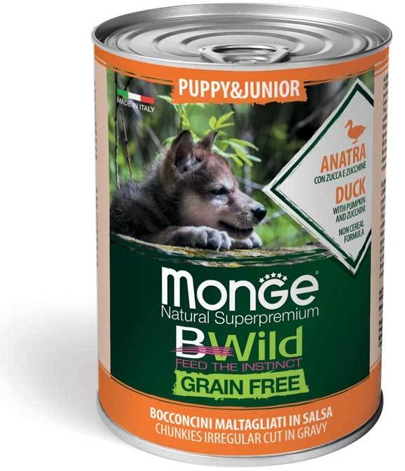 Monge Grain Free Junior Duck with Pumpkin and Zucchini está formulado pensando en el bienestar de los cachorros de todos los tamaños, gracias a la selección de fuentes alternativas de carbohidratos no derivados de los cereales, como el calabacín y la calabaza.