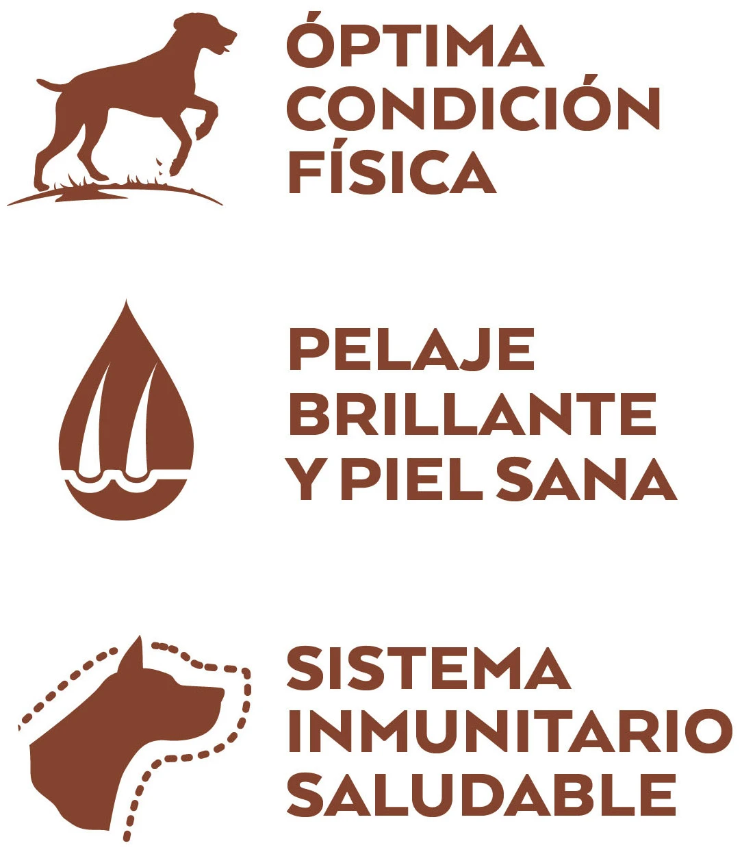 Pienso completo para perros adultos, a base de una formula que aporta una nutrición completa y equilibrada, inspirada en la alimentación natural del perro, que contiene carne o pescado deshuesados de 1ª calidad