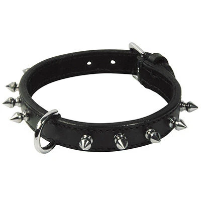 Collar de piel con tira de pinchos metálicos (puntas redondeadas). Regulable al cuello del perro. Cierre y argolla metálica que brindan seguridad y resistencia durante nuestros paseos..