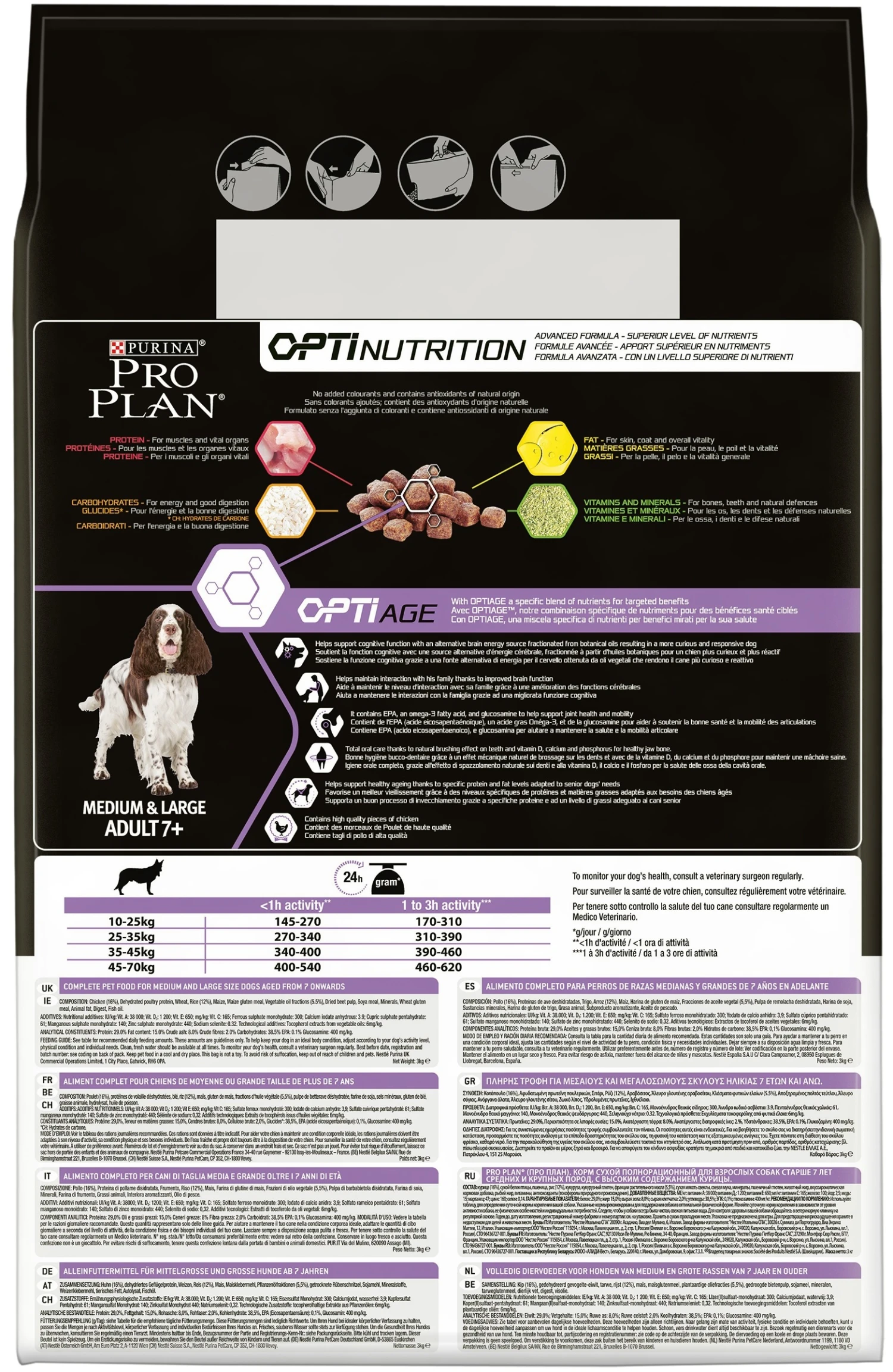 PURINA® PRO PLAN® Medium & Large Adult 7+ con OPTIAGE® rico en pollo es un alimento seco completo adaptado a las necesidades especiales de los perros mayores de 7 años.