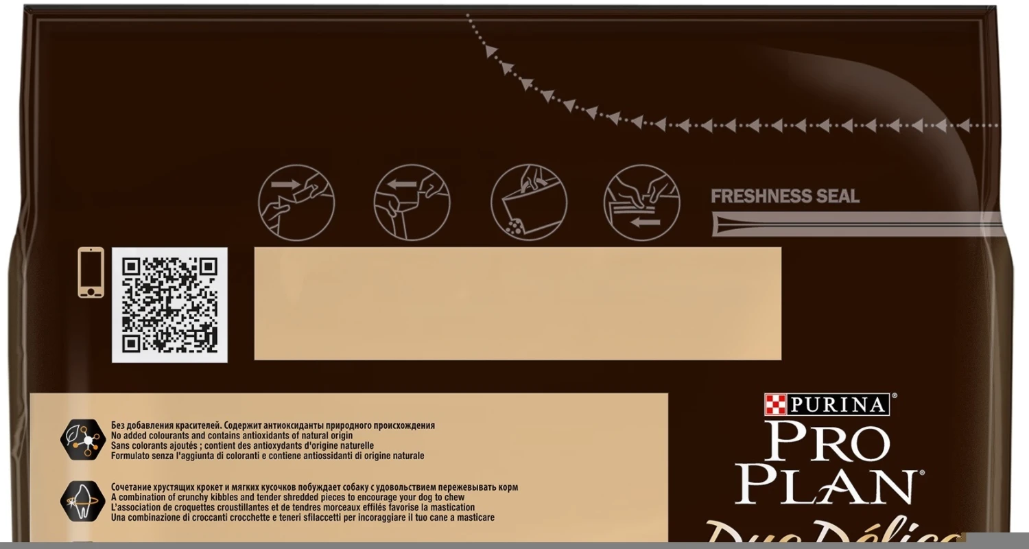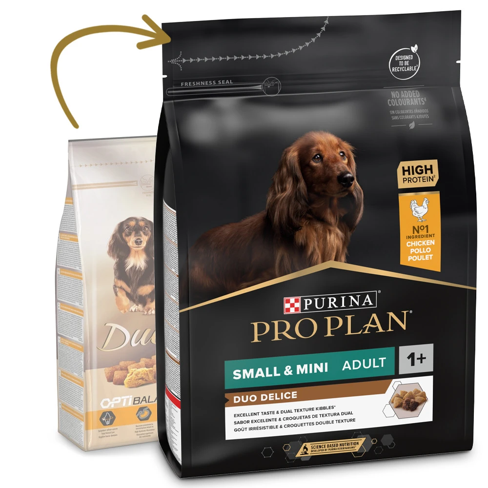 PURINA® PRO PLAN® DUO DÉLICE Small Adult rico en pollo es un alimento completo y equilibrado con la correcta combinación de nutrientes para ayudar a mantener la salud y el bienestar de los perros adultos de raza pequeña.