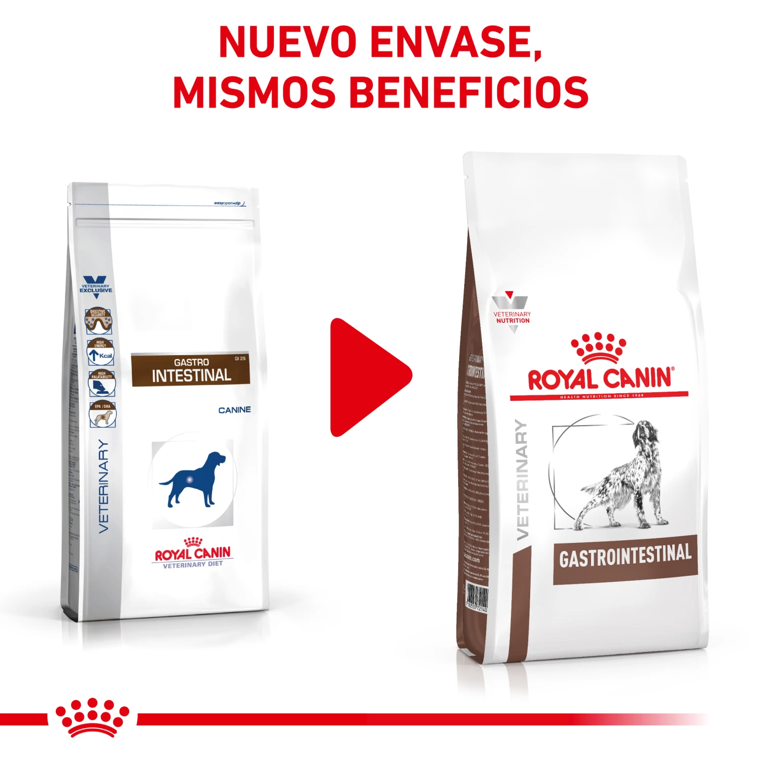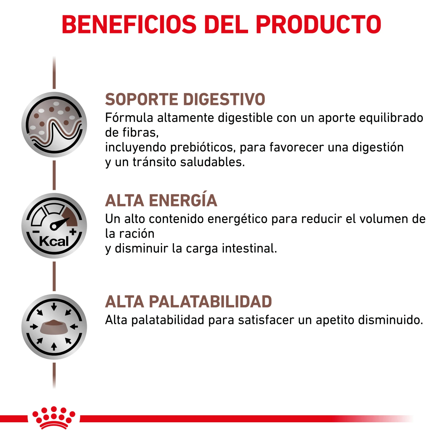 Beneficios clave de Royal Canin GastroIntestinal: Alta energía: Satisface las necesidades energéticas (mantenimiento, convalecencia) y permite reducir el volumen de la ración, disminuyendo así la carga digestiva.
