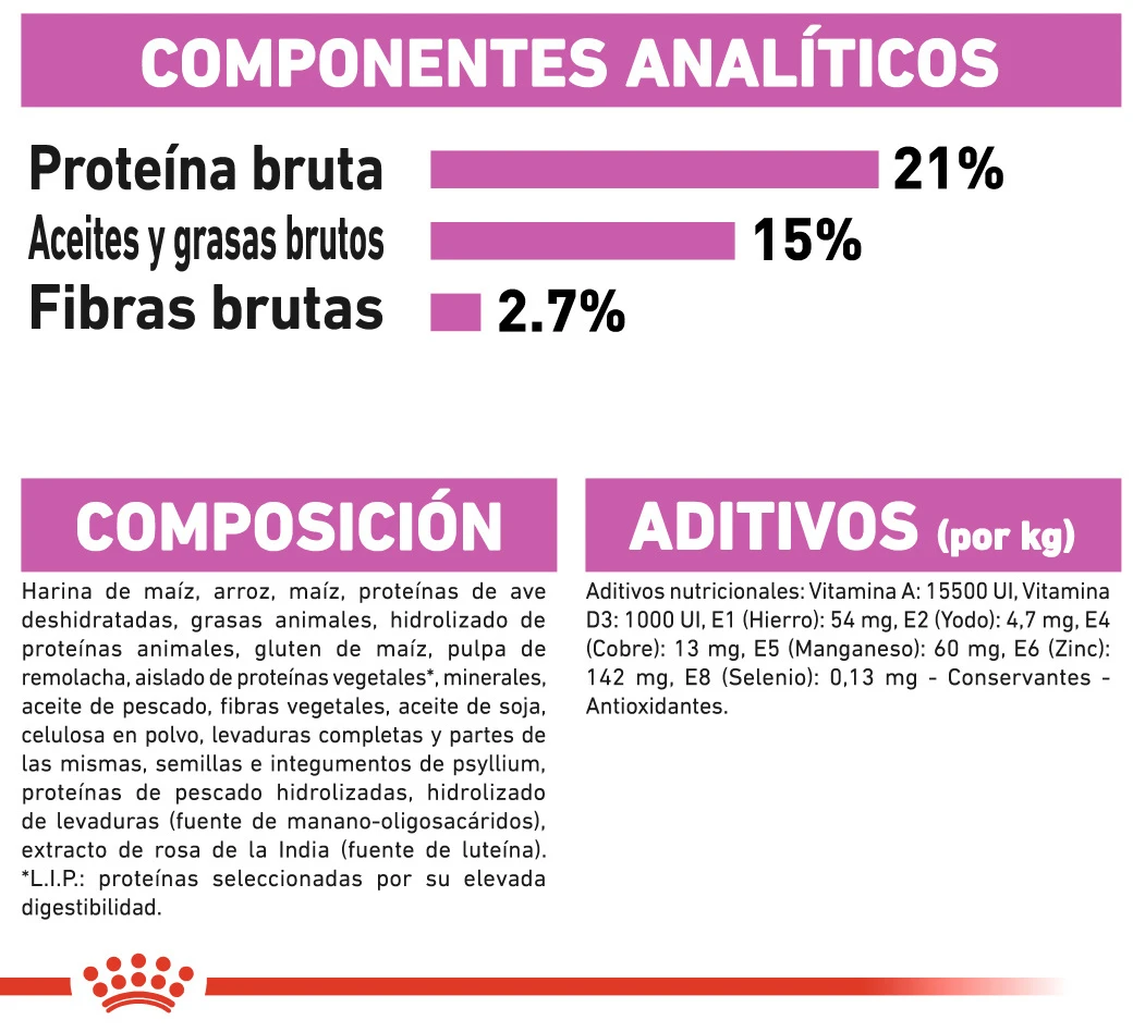 COMPOSICIÓN: harina de maíz, arroz, maíz, proteínas de ave deshidratadas, grasas animales, hidrolizado de proteínas animales, gluten de maíz, pulpa de remolacha, aislado de proteínas vegetales*, minerales, aceite de pescado, fibras vegetales, aceite de soja, celulosa en polvo, levaduras completas y partes de las mismas, semillas e integumentos de psyllium, proteínas de pescado hidrolizadas, hidrolizado de levadura (fuente de manano-oligosacáridos), extracto de rosa de la India (fuente de luteína).