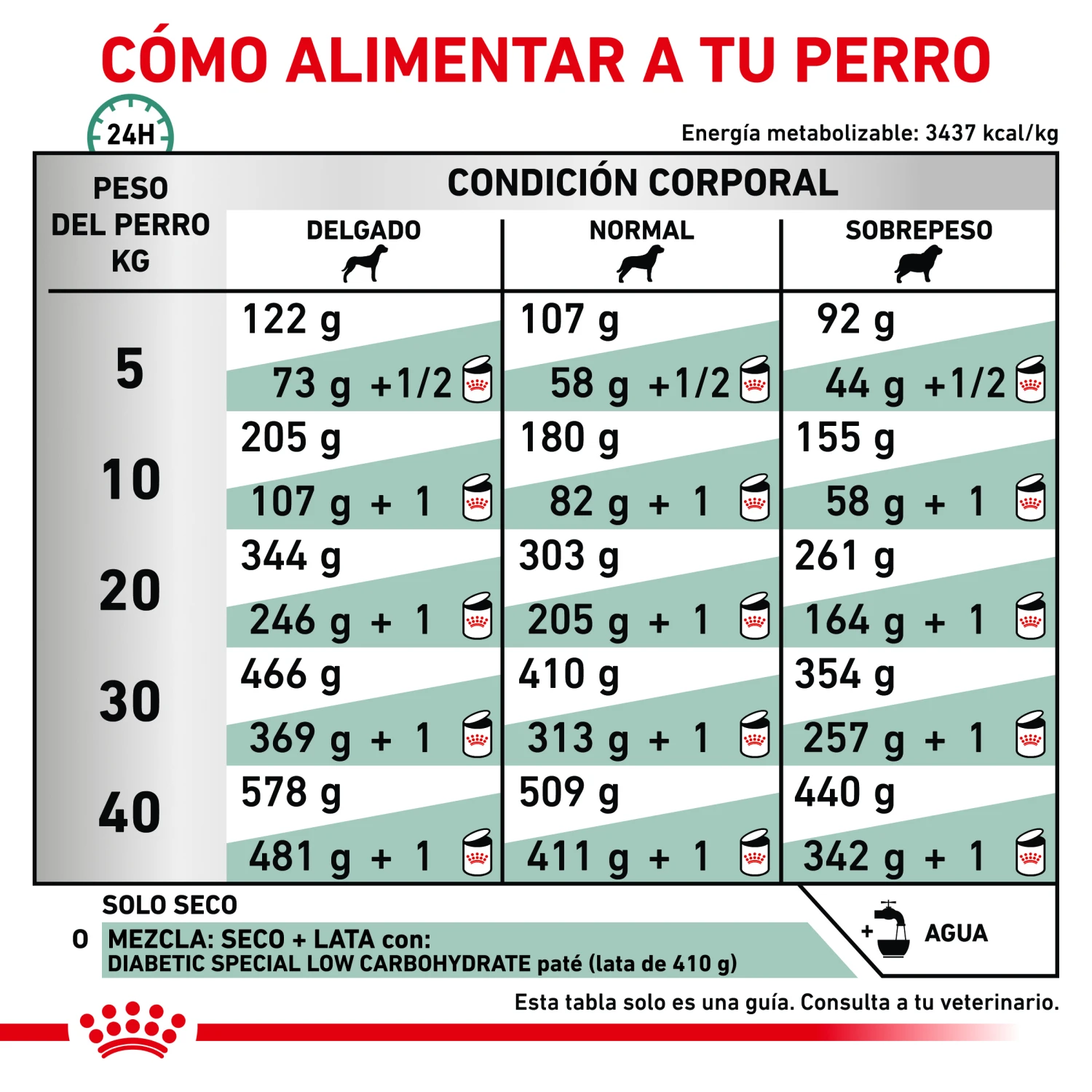 Atención: El uso de este producto generalmente incrementa la sensibilidad del perro a la insulina. Es muy recomendable controlar la glucosa y la respuesta a la insulina al comenzar la dieta, para ajustar la dosis de insulina administrada.
