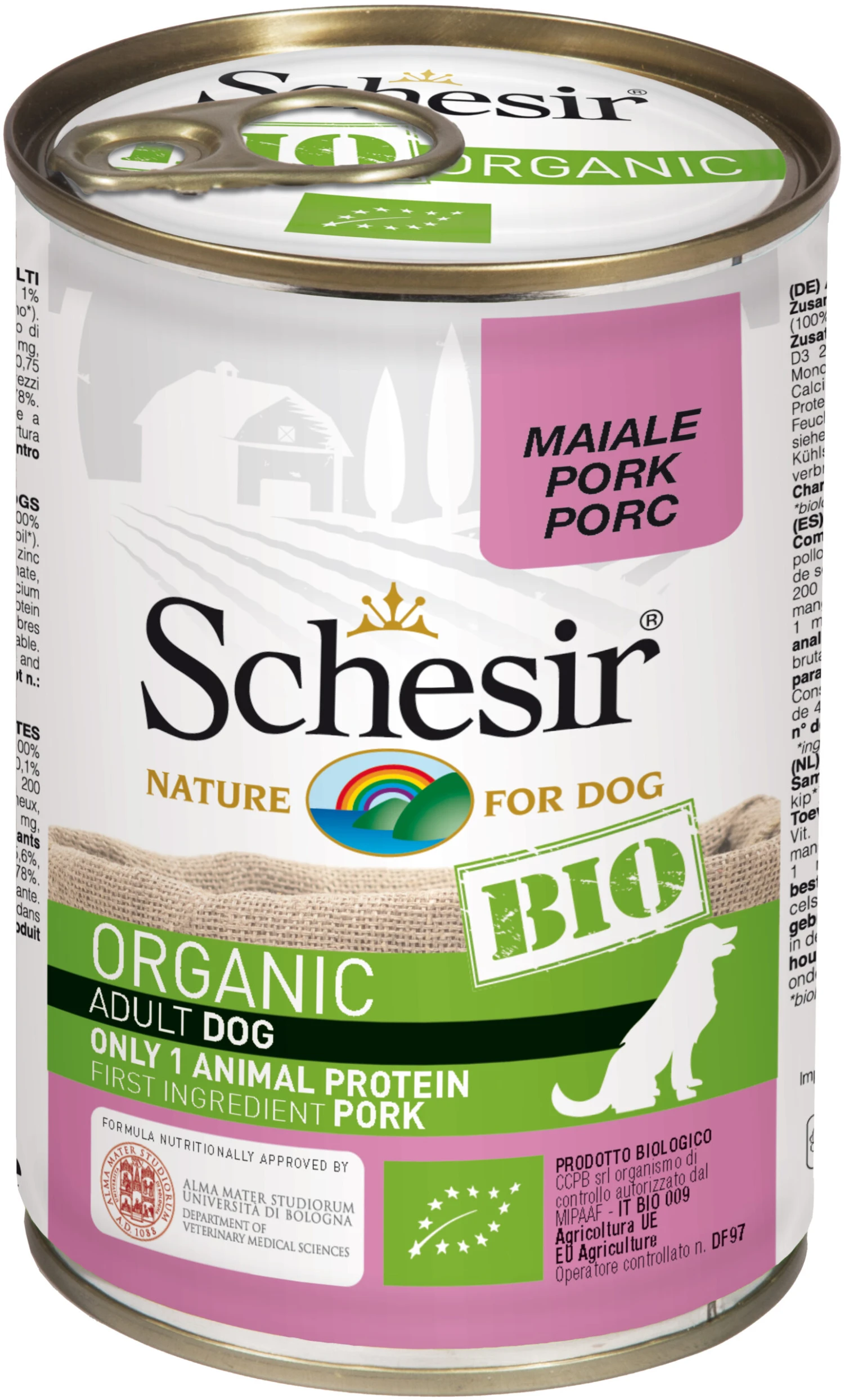 Descripción Pack 6 Comida Húmeda en Lata para Perro Bio de Cerdo Schesir