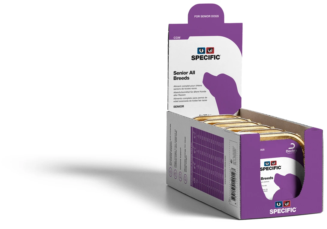 Dieta diaria para perros senior de todas las razas: pequeñas (a partir de 8 años), medianas (a partir de 7 años), grandes (a partir de 6 años) y gigantes (a partir de 5 años) SPECIFIC® CGW Senior All Breeds es una ayuda nutricional para ralentizar o prevenir enfermedades geriátricas en perros de edad avanzada